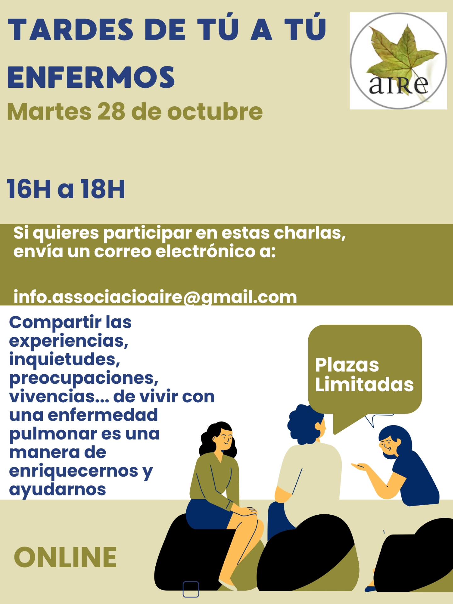 Tardes de tú a tú enfermos 22 Oct, 2025 | Noticias, Tardes de tu a tu Tardes de tú a tú enfermos Martes 28 de 16’00 a 18’00h. On line Plazas limitadas.