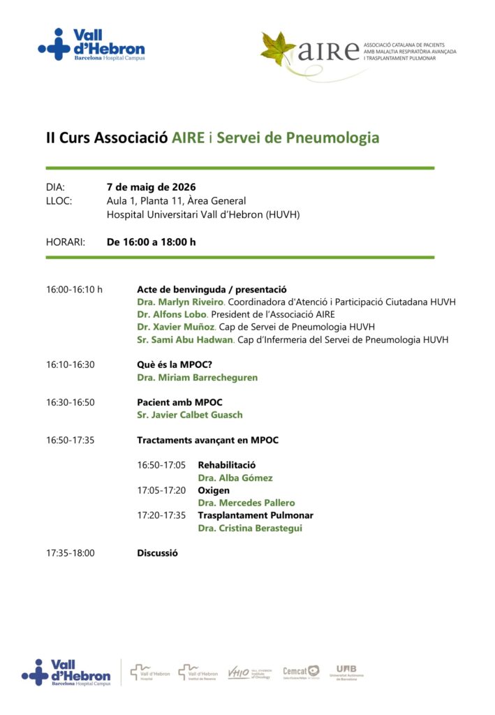 II Charla de Aire y Servicio de Neumología 21 Abr, 2026 | Noticias II Charla de Aire y Servicio de Neumología Nos hace mucha ilusión anunciar la segunda edición de este encuentro dedicado a la salud respiratoria, un espacio para aprender, compartir y resolver dudas con profesionales del sector. Jueves, 7 de mayo De 16:00 a 18:00 h Aula 1, planta 11, Área General Hospital Universitario Vall d’Hebron Plazas limitadas Inscripciones: info.associacioaire@gmail.com ¡Os esperamos a todos!